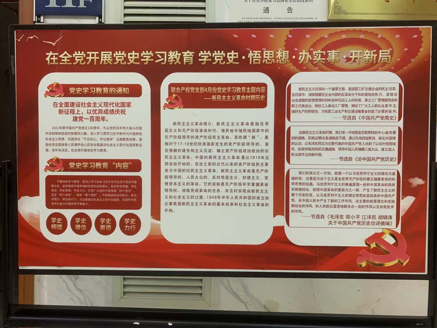 自黨史學(xué)習(xí)教育開展以來,聯(lián)合產(chǎn)權(quán)黨支部通過制定學(xué)習(xí)計(jì)劃、制作月度學(xué)習(xí)宣傳欄、組織黨員定期學(xué)習(xí)討論等方式持續(xù)推進(jìn)學(xué)習(xí)教育工作。下一步,聯(lián)合產(chǎn)權(quán)黨支部將繼續(xù)深入開展黨史學(xué)習(xí)教育主題活動(dòng),切實(shí)把黨史學(xué)習(xí)教育與總結(jié)經(jīng)驗(yàn)、觀照現(xiàn)實(shí)、推動(dòng)工作結(jié)合起來,切實(shí)做到學(xué)黨史、悟思想、辦實(shí)事、開新局,鍛造“不折不扣、不偏不倚”的政治執(zhí)行力,以優(yōu)異成績(jī)迎接建黨一百周年。