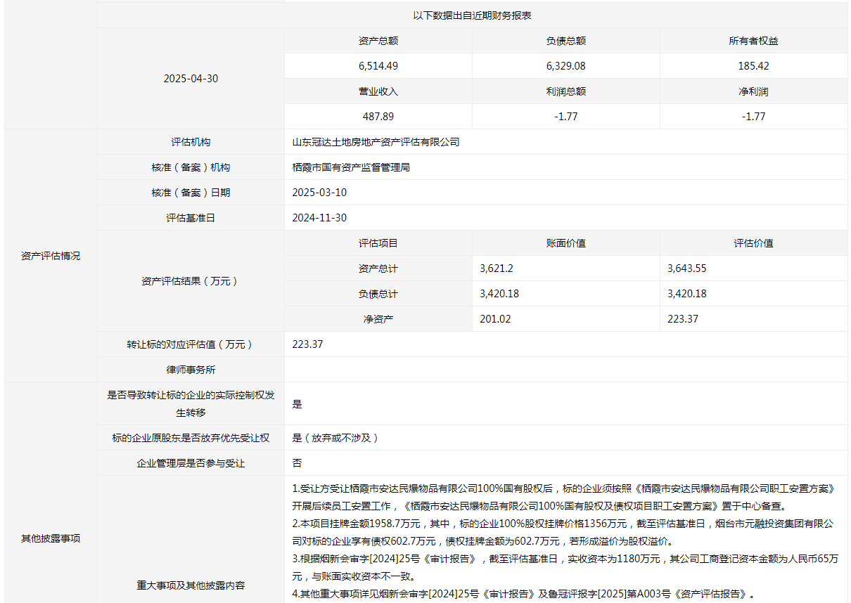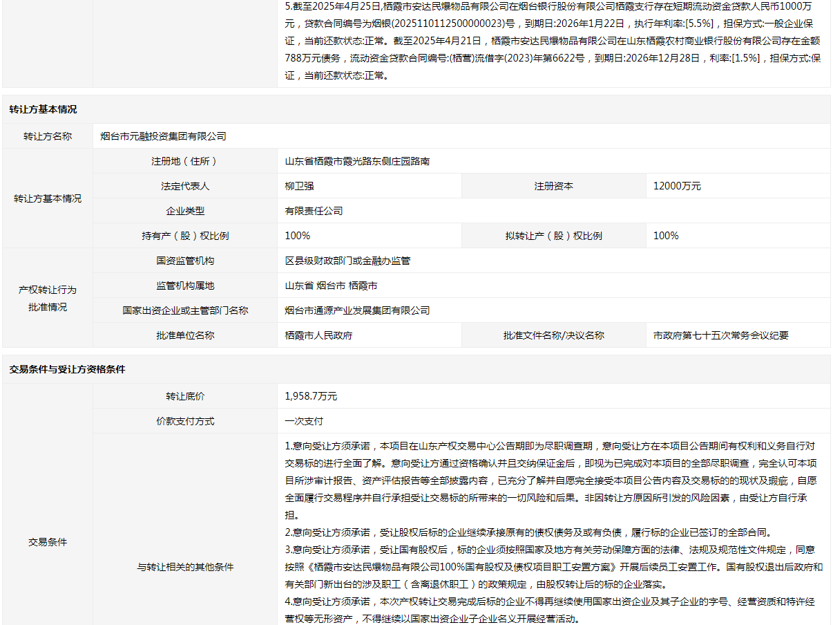 棲霞市安達(dá)民爆物品有限公司100%國有股權(quán)及債權(quán)