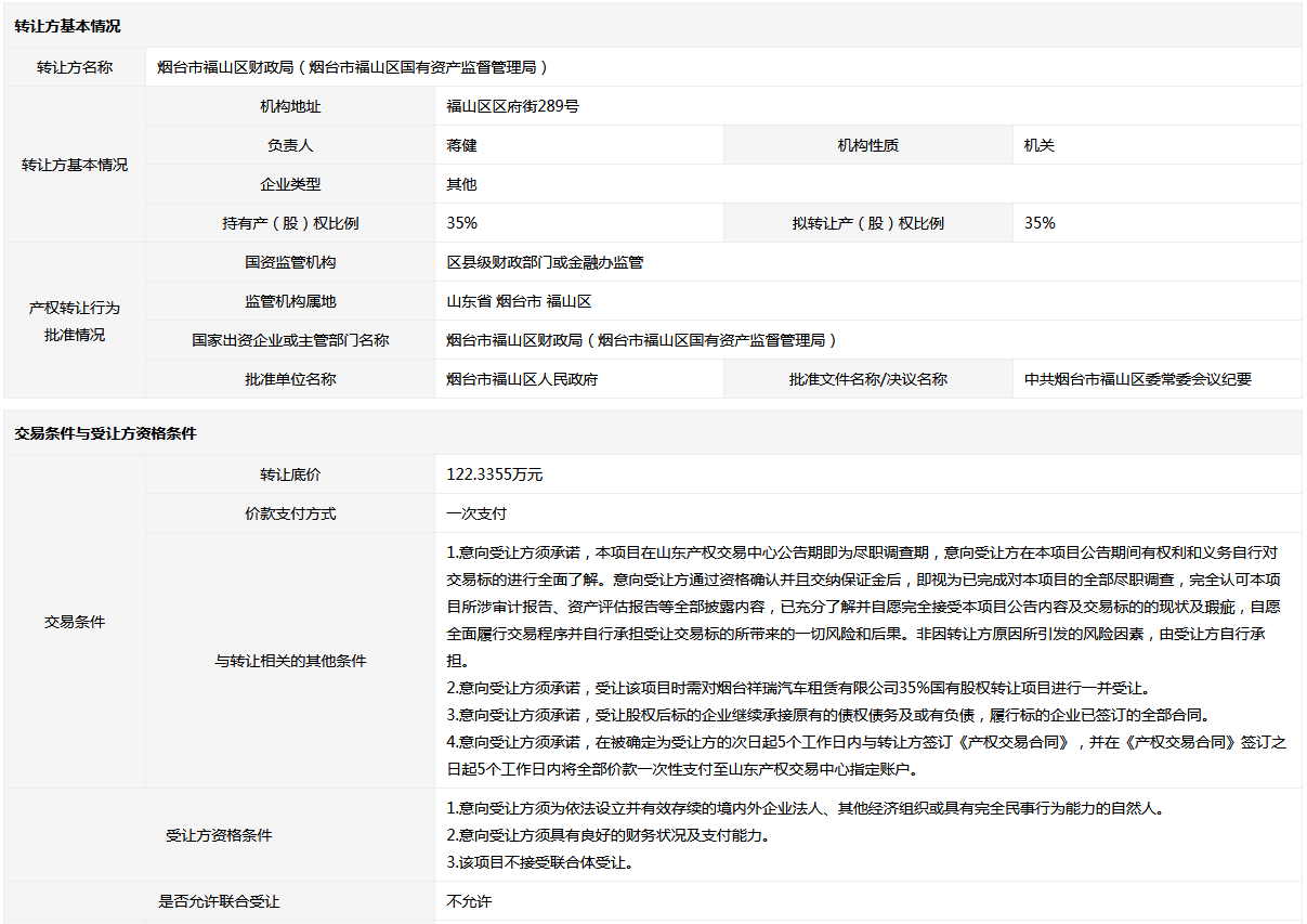 煙臺祥瑞旅游汽車有限公司35%國有股權(quán)