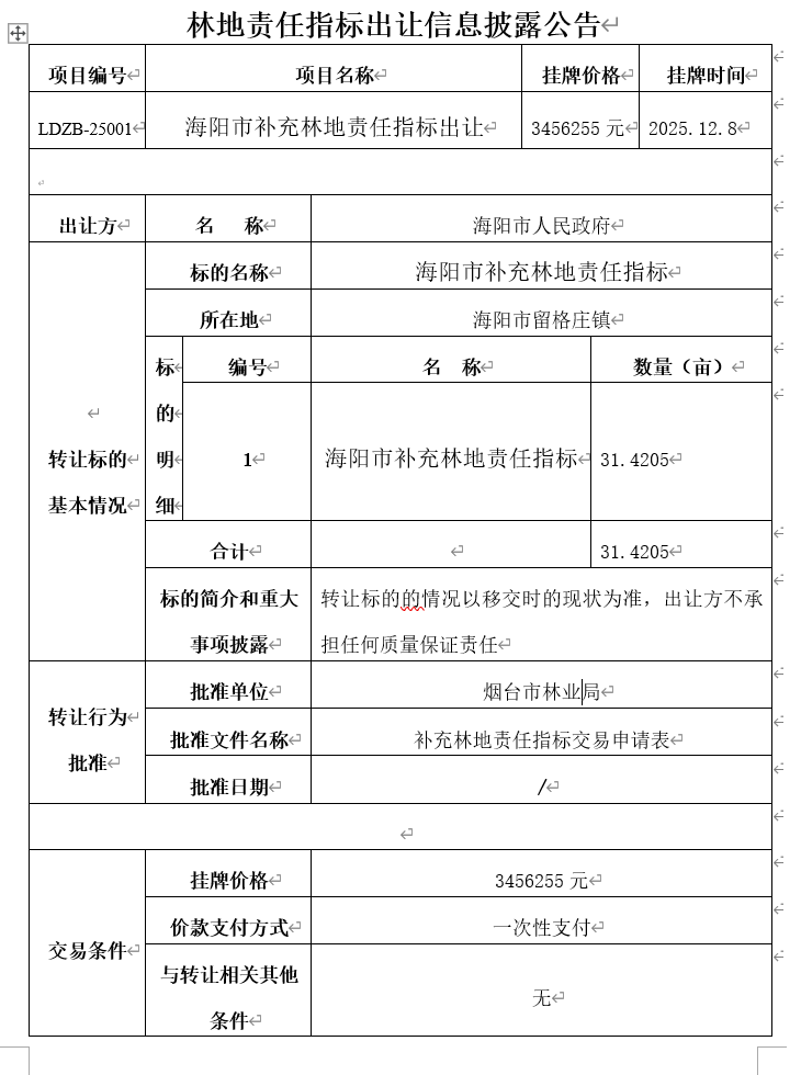 海陽市補(bǔ)充林地責(zé)任指標(biāo)出讓