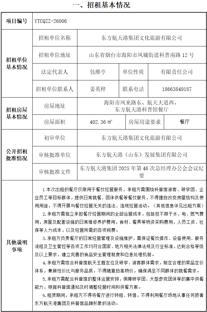 東方航天港科普館餐廳租賃運(yùn)營服務(wù)項目