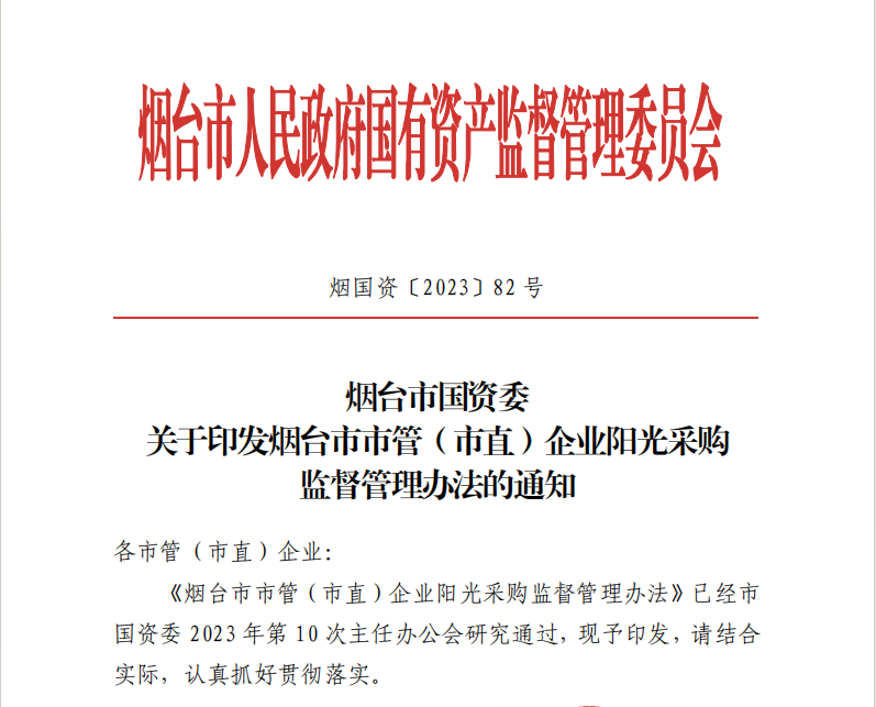 2024年6月30日,煙臺市國資委正式發(fā)布《煙臺市市管(市直)企業(yè)陽光采購監(jiān)督管理辦法》(以下簡稱:《管理辦法》),對進一步加強國有企業(yè)陽光采購工作作出部署安排。
